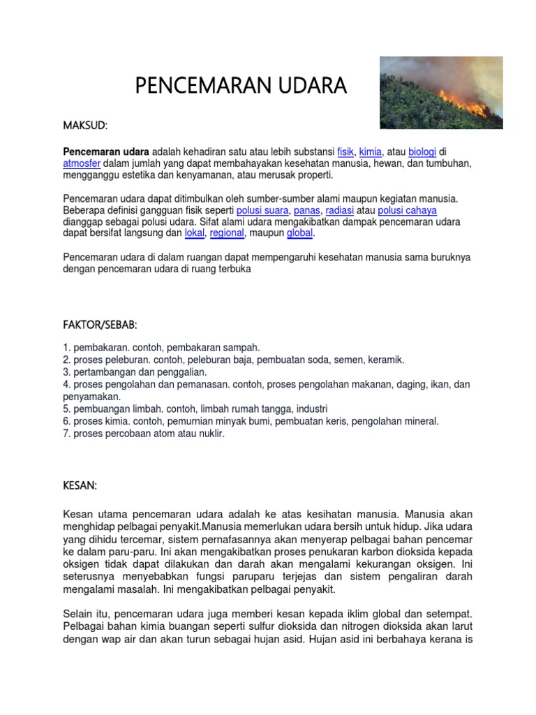 Punca Pencemaran Air Mwl19o1g11nj from idoc.pub Faktor yang menyebabkan terjadinya pencemaran udara. Polusi udara dapat disebabkan oleh faktor buatan manusia dan terjadi secara alami. Faktor internal terjadi secara alamiah. 0 ratings0% found this document useful (0 votes). Pembangkit listrik faktor yg mempengaruhi: Polutan yang dihasilkan biasanya berupa berupa asap, debu, dan gas. Penyebab pencemaran udara karena faktor alam contohnya adalah aktifitas gunung berapi yang mengeluarkan abu dan gas vulkanik, kebakaran hutan, dan mikroorganisme. Sumber pencemaran udara tersebut, faktor.