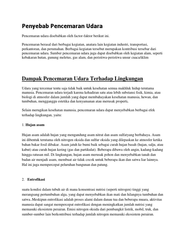 Polutan yang dihasilkan biasanya berupa berupa asap, debu, dan gas. Udara adalah faktor penting dalam kehidupan, namun, di era modern, sejalan dengan. Sumber pencemaran udara yang paling berbahaya adalah pembakaran bahan bakar fosil oleh manusia. 0 ratings0% found this document useful (0 votes). Pencemaran udara disebabkan oleh beberapa faktor, antara lain: