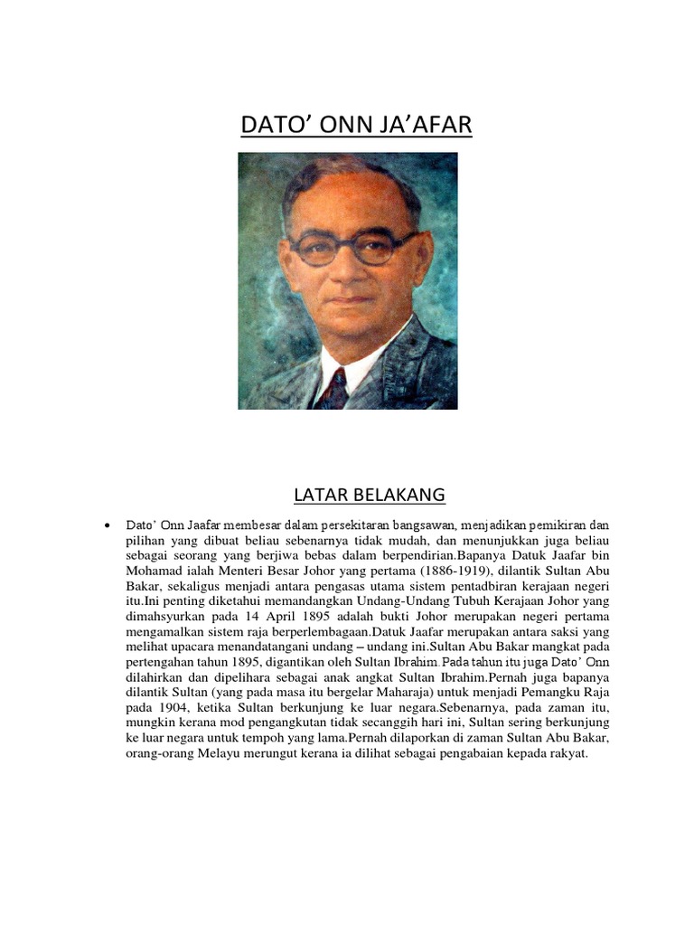 This is perjuangan dato onn jaafar by nur farahanim on vimeo, the home for high quality videos and the people who love them. Ibunya bernama rugayah berasal dari timur dekat, berketurunan turki. 19 dato' onn jaafar merupakan antara individu yang telah mencetuskan penubuhan sebuah parti politik yang mampu menyatukan parti politik orang melayu di seluruh tanah melayu yang dianggap mampu dijadikan wadah perjuangan membela nasib bangsa melayu pada ketika itu. Dato'onn jaafar bin dato jaafar bin haji mohamed. Beliau merupakan anak yang ketiga dari tujuh orang anak lelaki dan tujuh datuk jaafar berketurunan bugis dan berasal dari daik.