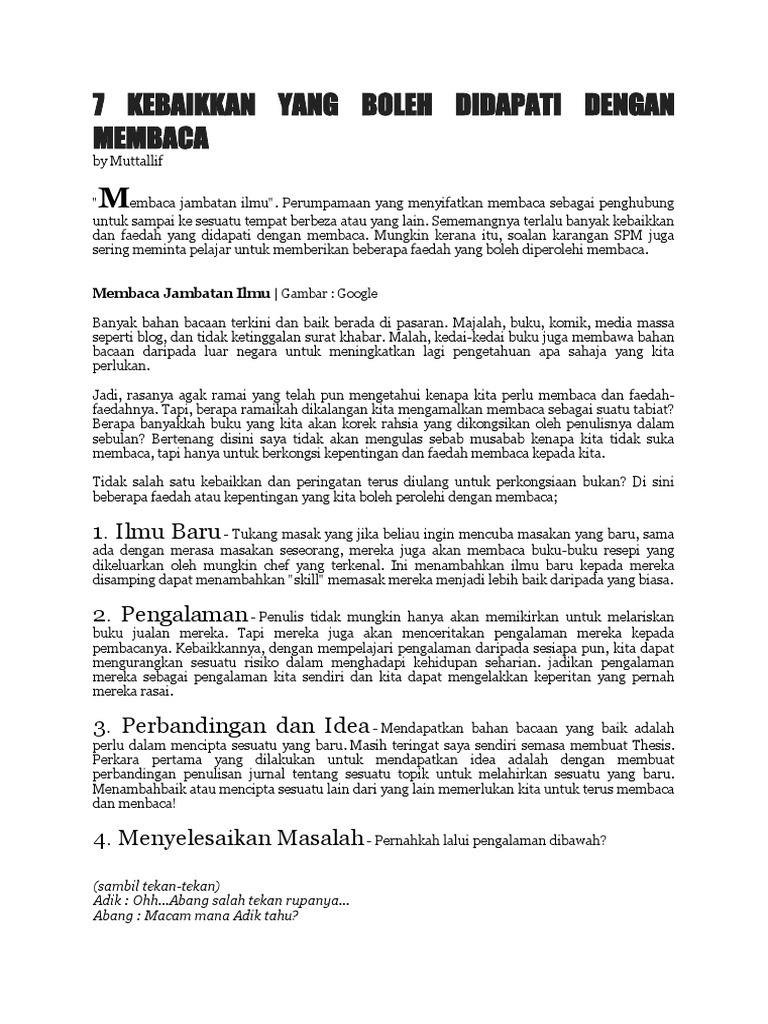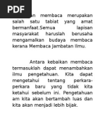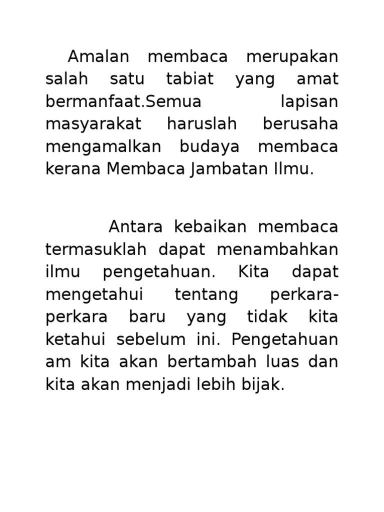 Membaca menjadikan kita seorang yang berilmu dan dihormati. Proses penafasan manusia melibatkan proses menarik nafas dan menghembus nafas. Membaca jambatan ilmu, tidak membaca jambatan kehancuran. Manakala internet (huruf 'i' besar) ialah sistem komputer umum. Kesimpulannya, kita memperolehi banyak ilmu daripada aktiviti membaca.