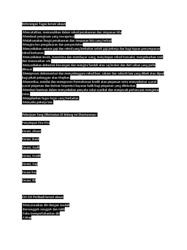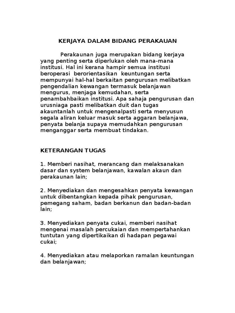 Keterangan Tugas Kerani Akaun from imgv2-1-f.scribdassets.com Buat fail & susun dokumen dengan sistematik & teratur. Mahir menggunakan perisian akaun ubs, autocount dan ms office 5. Bank islam | jawatan kosong di koperasi bank islam permohonan adalah diperlawa kepada seluruh masyarakat malaysia yang berkelayakan bagi memenuhi kekosongan jawatan sebagai kerani akaun koperasi. Cari peranan kerani akaun yang berlainan kerani junior biasanya melakukan tugas seperti kemasukan data, memproses invois dan kerja kertas, mengekalkan fail maklumat dan tugas umum. Secara umumnya, skop kerja dan bidang tugas yang dilaksanakan oleh seorang pegawai tadbir diplomatik adalah seperti berikut: Bekerja adalah salah satu cara untuk mendapat rezeki yang halal. Membuat fotokopi dan memfaksimile dokumen. Apakah kerani akaun, apa sebenarnya yang mereka lakukan dan berapa banyak yang boleh mereka perolehi?
