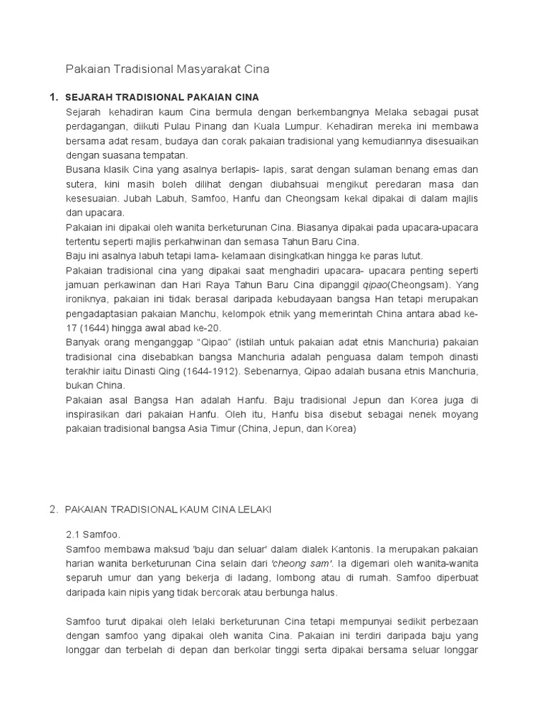 6 simbol dan maksud di sebalik pakaian yang menjadi kepercayaan masyarakat cina ini akan dipakai oleh mereka yang berkenaan sahaja. Pakaian cheongsam atau 'baju panjang'. •pakaian ini sesuai digunakan dalam majlis dan upacara tertentu. Karena sebetulnya ada banyak macam baju tradisional cina, namun sampai saat ini yang paling terkenal adalah cheongsam. Tanglung kertas cina tradisional ini biasanya berbeza daripada tanglung yang digunakan ketika perayaan kuih bulan. Pakaian tradisional kaum cina cheongsam samfoo cheongsam ini dipakai oleh wanita berketurunan cina dipakai untuk majlis perkahwinan atau perayaan daripada kain. Bahan ini kemudian akan diolah bersama rempah yang digunakan oleh kaummelayu seperti kayu. Setiap adat yang dijalankan mempunyai maksud yang tersendiri. Pakaian tradisional cina ini memiliki beragam jenis, mulai hanfu baju adat cina jaman dahulu hingga yang masih ada hingga saat ini. Tradisional pakaian tradisional kaum cina. Pakaian tradisional masyarakat cina lelaki 1.samfoo membawa maksud 'baju dan seluar' dalam bahasa dialek kantonis. Pakaian tradisional orang melayu terengganu yang biasa dikenakan oleh masyarakat sekarang dengan baju kurung teluk belanga dan lelakinya baju melayu teluk belanga. Pakaian jubah labuh merupakan satu jenis baju tradisional yang biasa dipakai oleh lelaki bangsa cina semasa tahun baru cina.