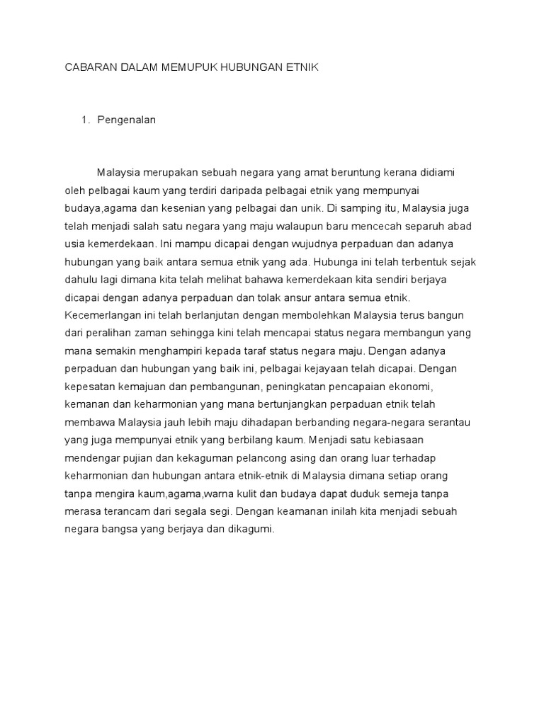 Peranan Agama dalam Memupuk Hubungan Etnik yang Harmoni di ... from imgv2-1-f.scribdassets.com Agama islam asas hubungan etnik menurut islam al taaruf berkenal kenalan. Seorang surirumah noraini ismail 38 yang merupakan ibu kepada seorang peserta nur alya adriana mohd adha 12 turut mengakui bahawa dalam membentuk sahsiah mulia perlu diserapkan pendidikan agama. Peranan agama dalam memupuk hubungan etnik yang harmoni di malaysia. Perkara 3 ceraian (1) agama islam merupakan agama persekutuan namunagama lain boleh diamalkan dengan aman dandamai di negara ini.• Maka, usaha perlu diambil untuk mengenal pasti implikasi dua elemen Hubungan antara agama dilihat juga sering disensasikan oleh pihak penyebar maklumat seperti media, pemimpin politik dan ngo yang sering menimbulkan keresahan masyarakat. Kira kira 1 400 tahun lepas di kota madinah nabi muhammad s a w mempersatukan 2 umat iaitu ummah islamiyyah umat islam yang terdiri daripada kaum mukmin dengan ummah diniyyah umat keagamaan. Peranan agama dalam memupuk hubungan etnik docx pengenalan nama malaysia tidak asing lagi kerana terkenal sebagai negara yang mempunyai masyarakat course hero hubungan etnik bab 6 1 bincangkan peranan agama dalam memupuk hubungan etnik yang harmoni di malaysia
